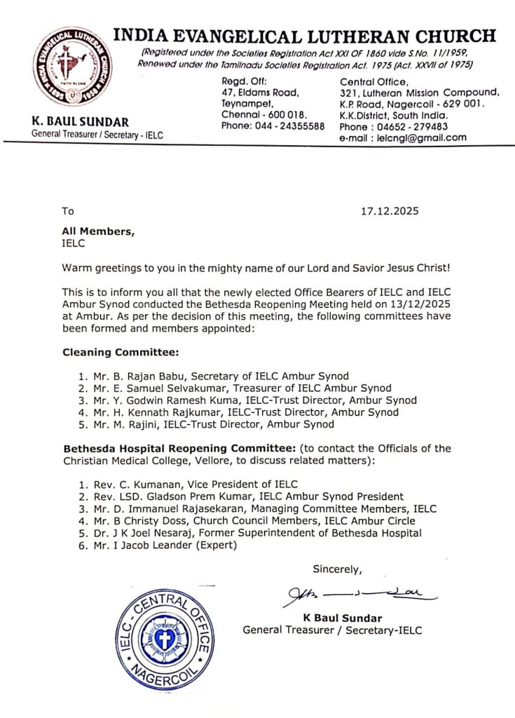 COMMITTEES FORMED AT THE BETHESDA HOSPITAL REOPENING MEETING ON 13-12-2025