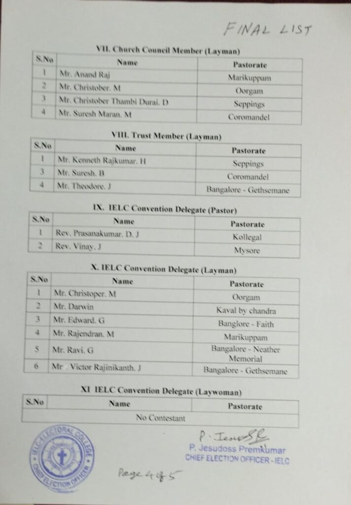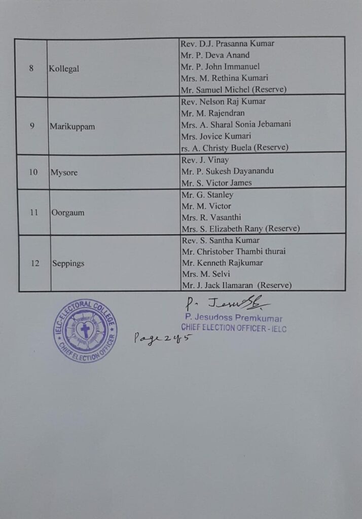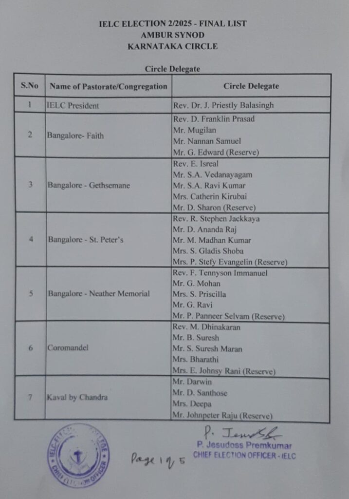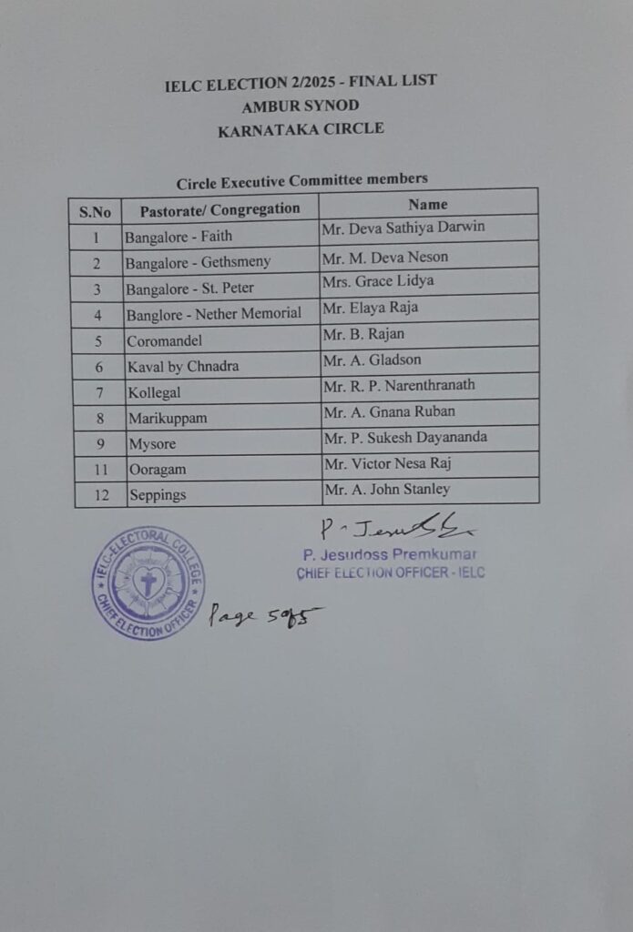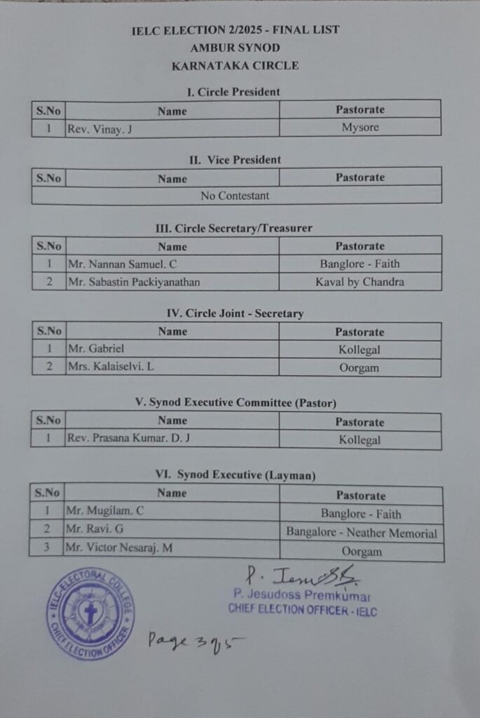 Final List of candidates / delegates in Karnataka Circle – Ambur Synod