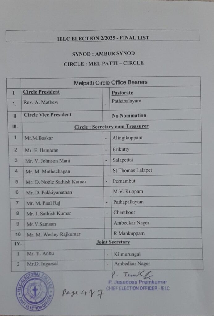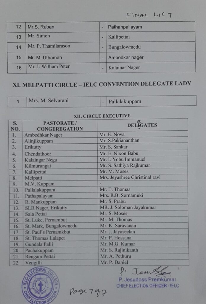 Final List of candidates / delegates in Melpatti Circle – Ambur Synod