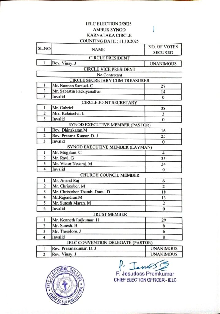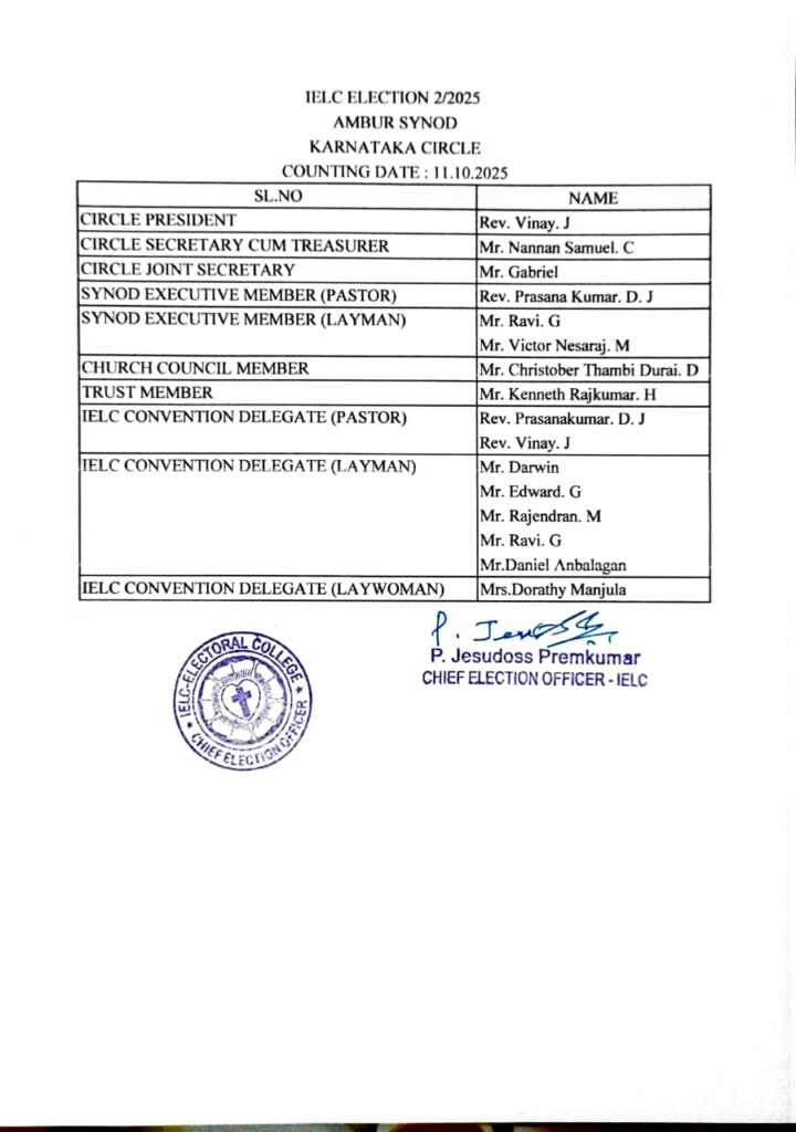 IELC ELECTION – 2/2025, AMBUR SYNOD – KARNATAKA CIRCLE ELECTION RESULTS