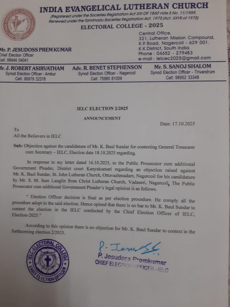 IELC ELECTION 2/2025 – NAGERCOIL SYNOD CONVENTION RESULTS FOR SYNOD OFFICE BEARERS AND IELC OFFICE BEARERS PUBLISHED