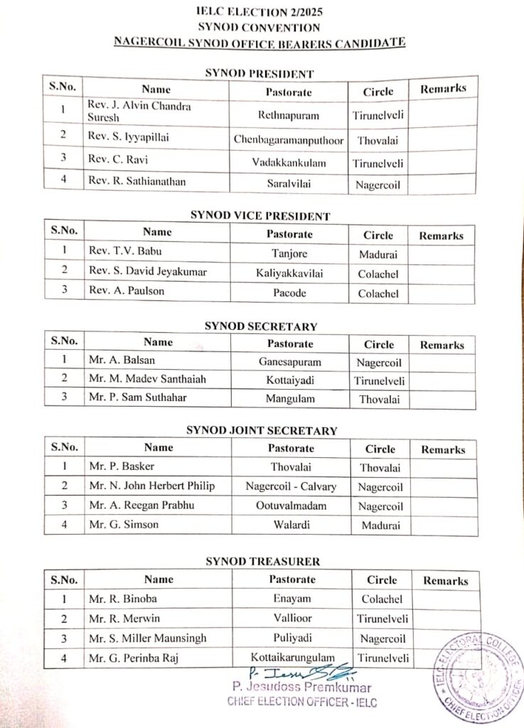 Nagercoil Synod Circle Election Results – Trinelveli Circle.