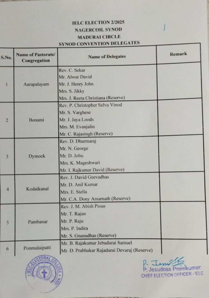 IELC ELECTION – 2/2025, NAGERCOIL SYNOD – MADURAI CIRCLE – FINAL VOTERS LIST