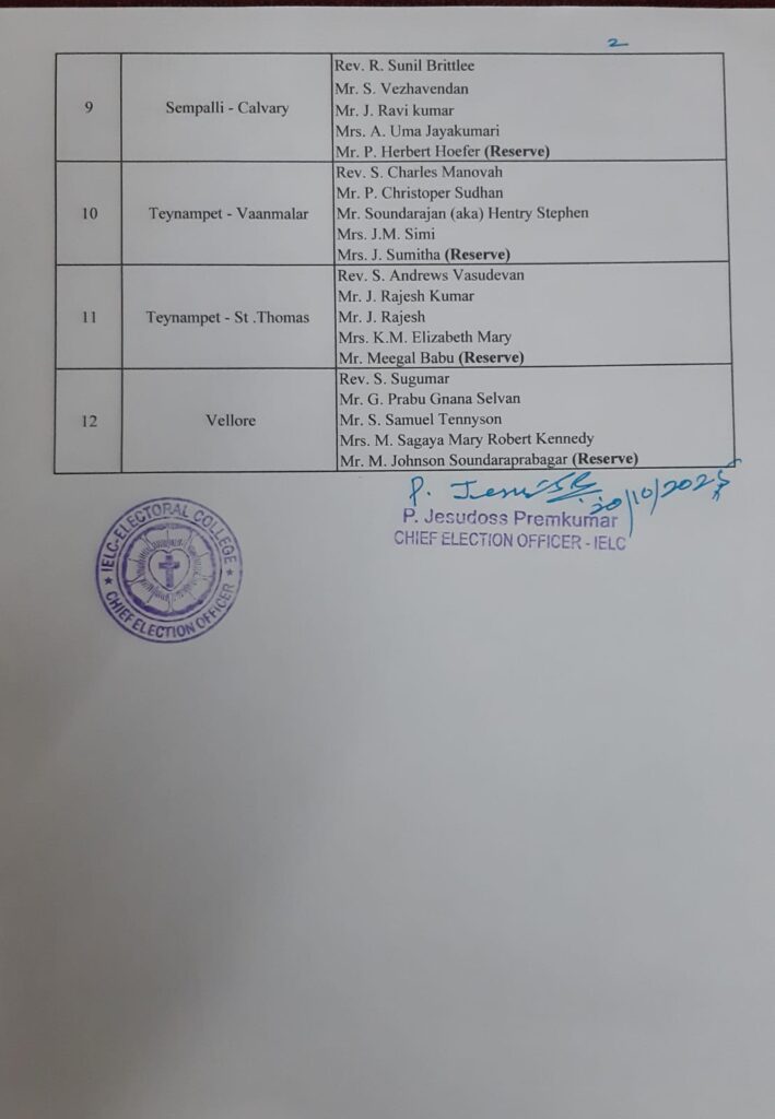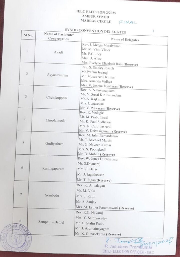 • List of candidates / delegates in Madras Circle – Ambur Synod - 05/08/2025