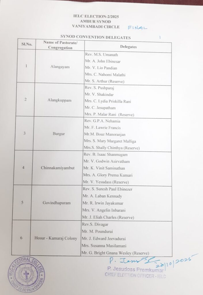 IELC ELECTION – 2/2025, SYNOD CONVENTION -AMBUR SYNOD – VANIYAMBADI CIRCLE – FINAL VOTERS LIST