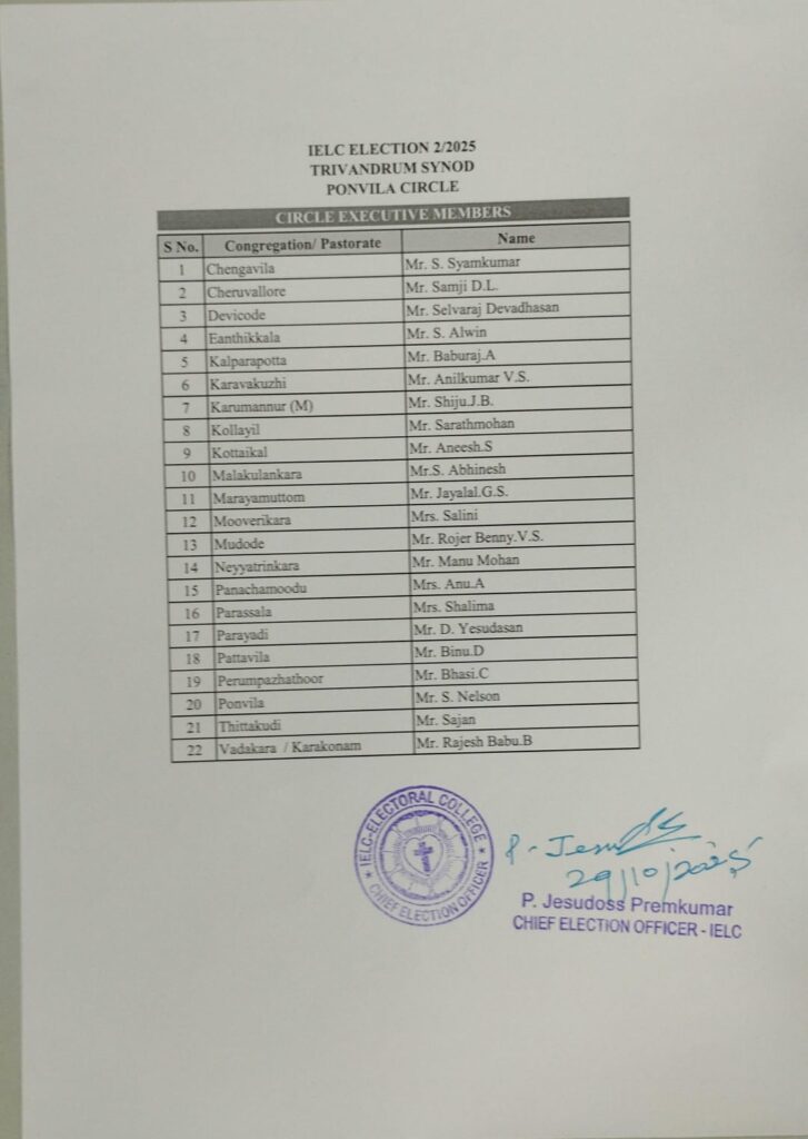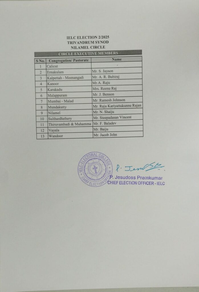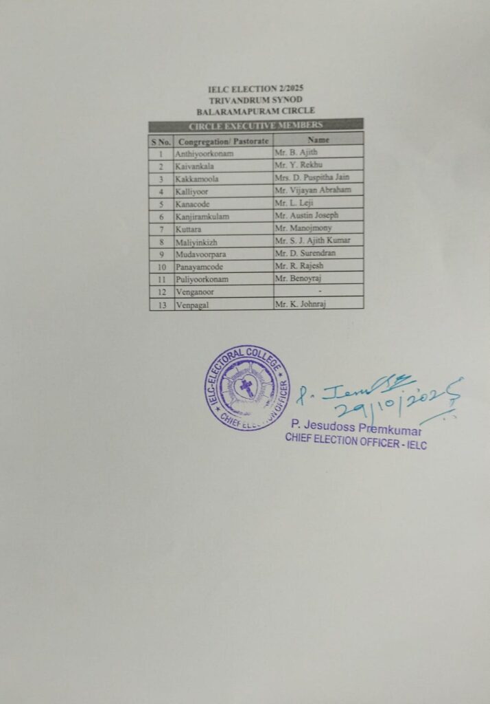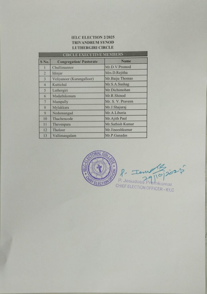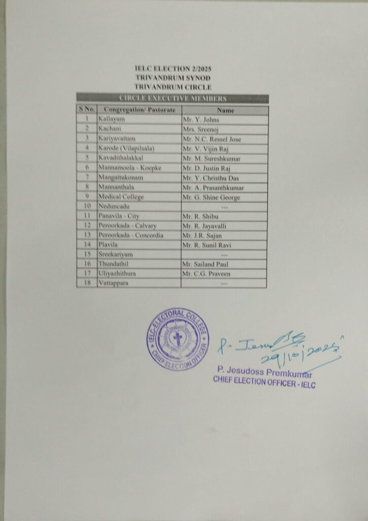 IELC ELECTION 2/2025 – TRIVANDRUM SYNOD – CIRCLE EXECUTIVE MEMBERS.