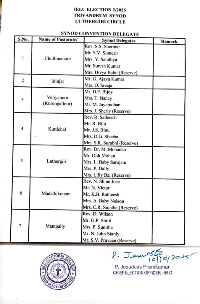 IELC ELECTION – 2/2025, TRIVANDRUM SYNOD – LUTHERGIRI CIRCLE VOTERS LIST