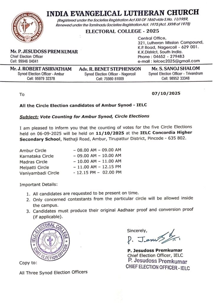 Information on Vote Counting for Ambur Synod, Circle Elections.