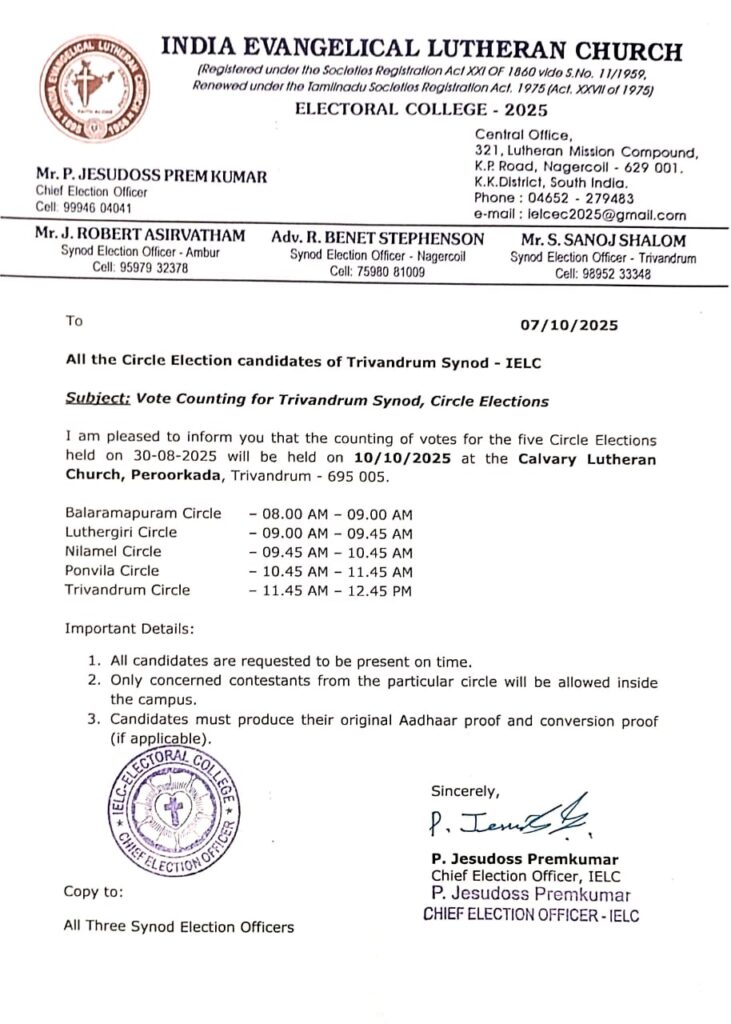 Information on Vote Counting for Trivandrum Synod, Circle Elections