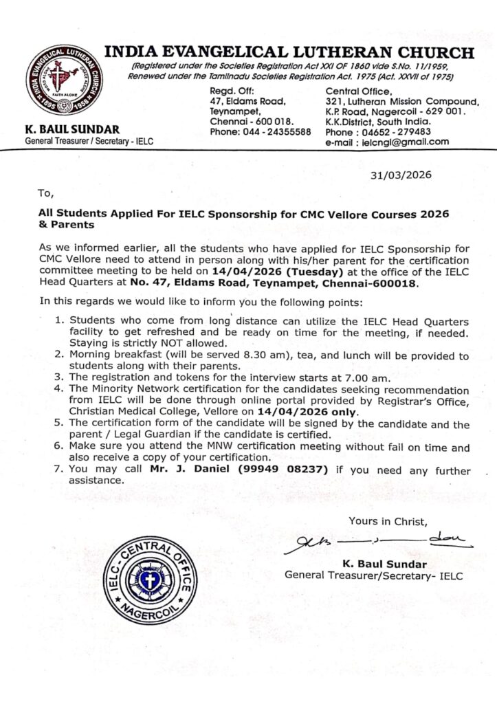 INFORMATION RELATED TO MNW CERTIFICATION MEETING (IELC SPONSORSHIP FOR CMC VELLORE COURSES – 2026) ON 14/04/2026.