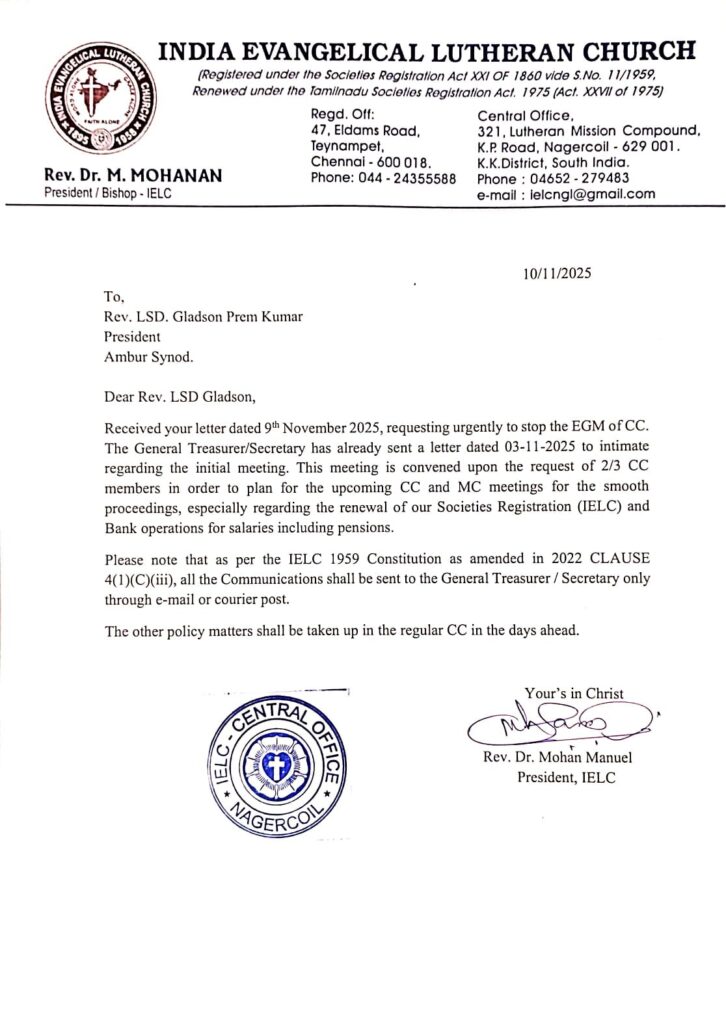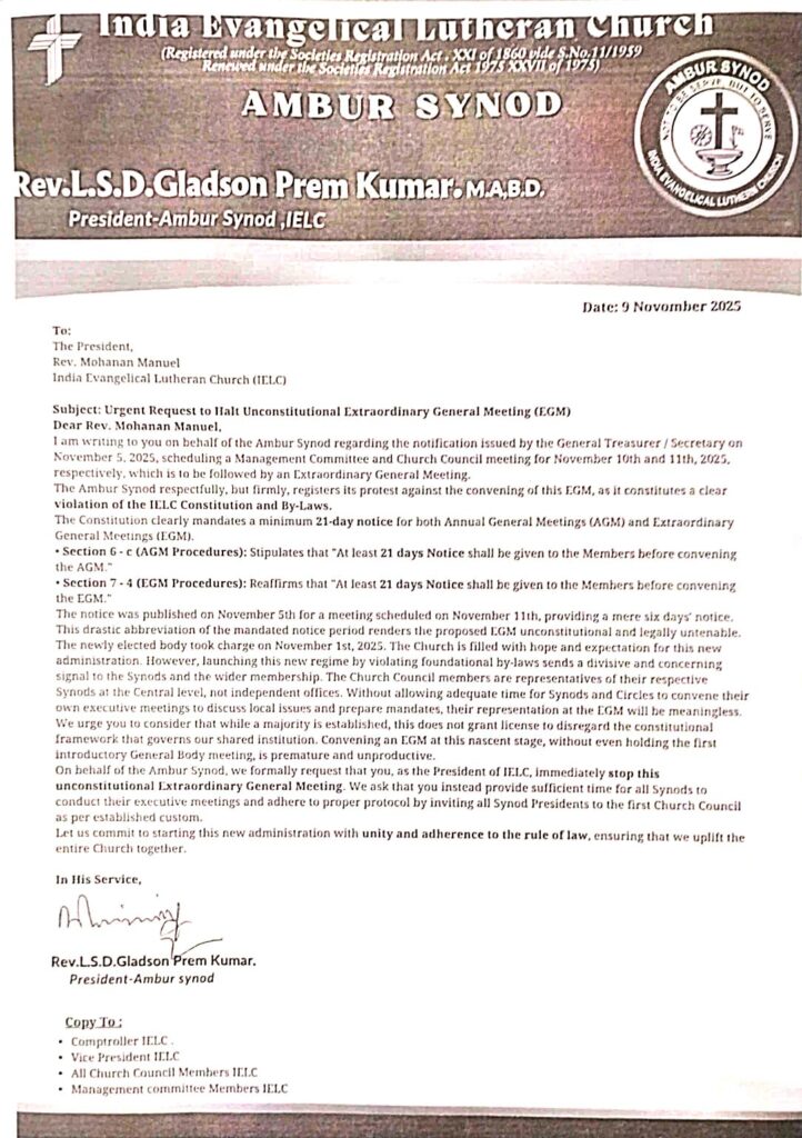 Letter From the President-Ambur Synod, IELC and the Reply from The President, IELC.