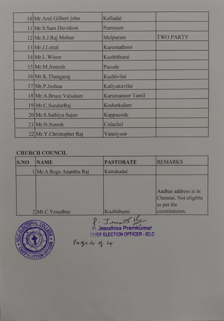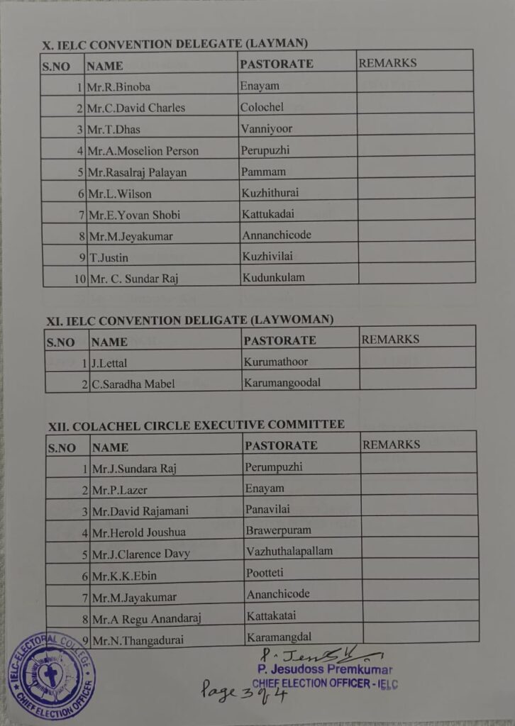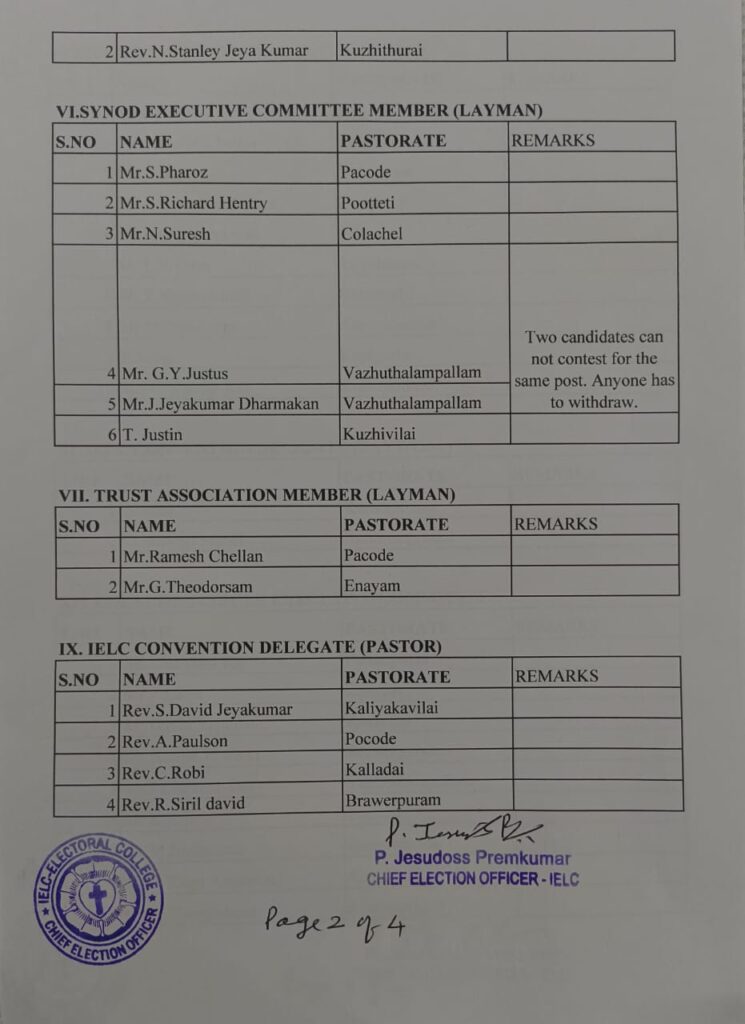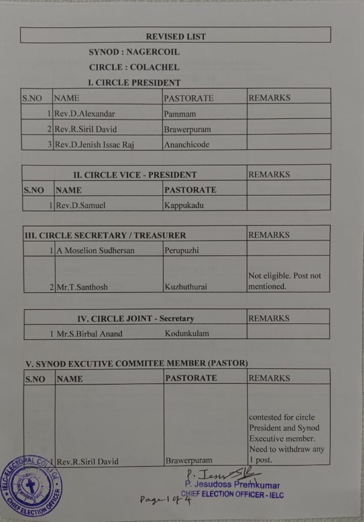 Revised List of candidates / delegates in Colachel Circle – Nagercoil Synod