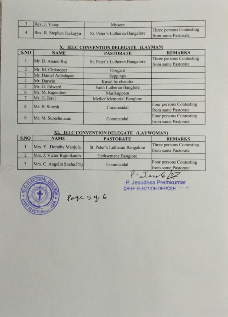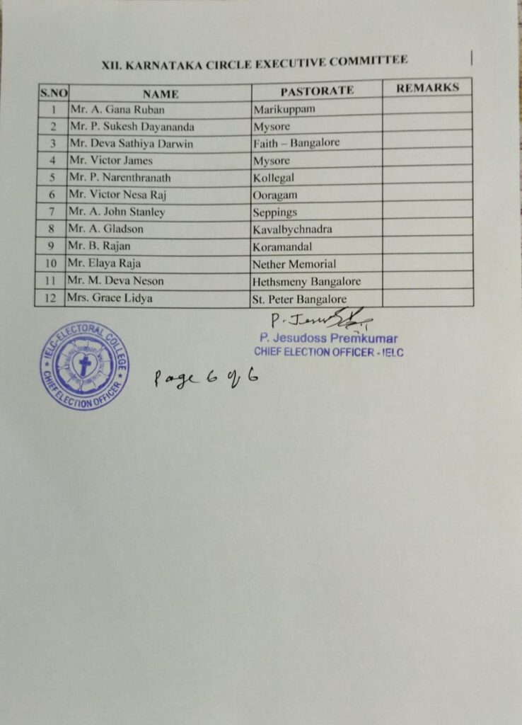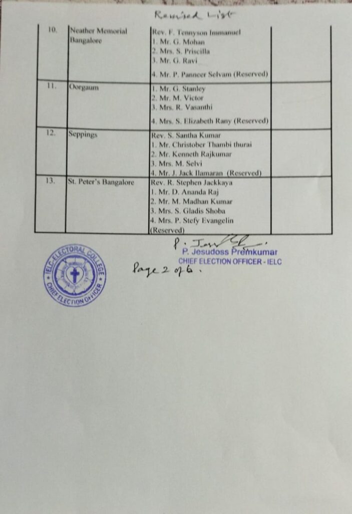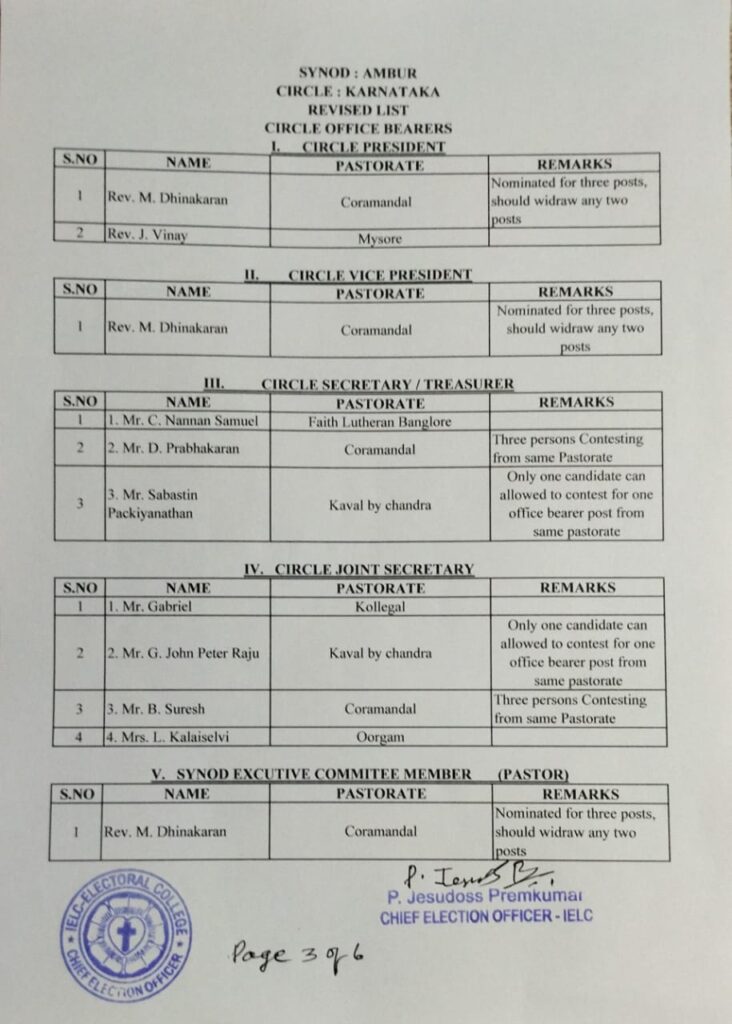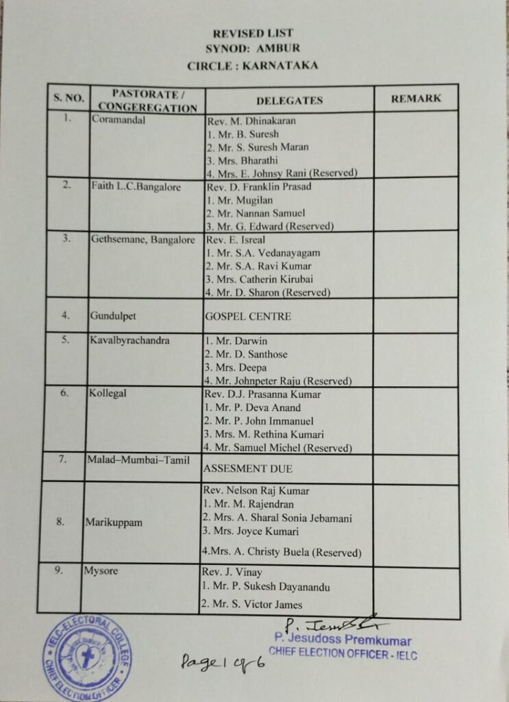 Revised List of candidates / delegates in Karnataka Circle – Ambur Synod