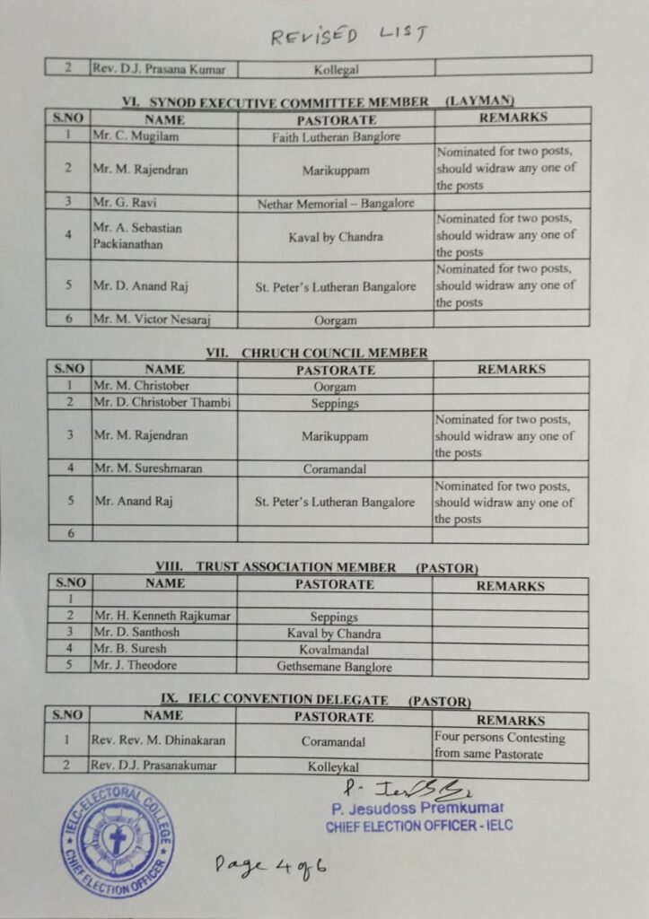 Revised List of candidates / delegates in Madras Circle – Ambur Synod