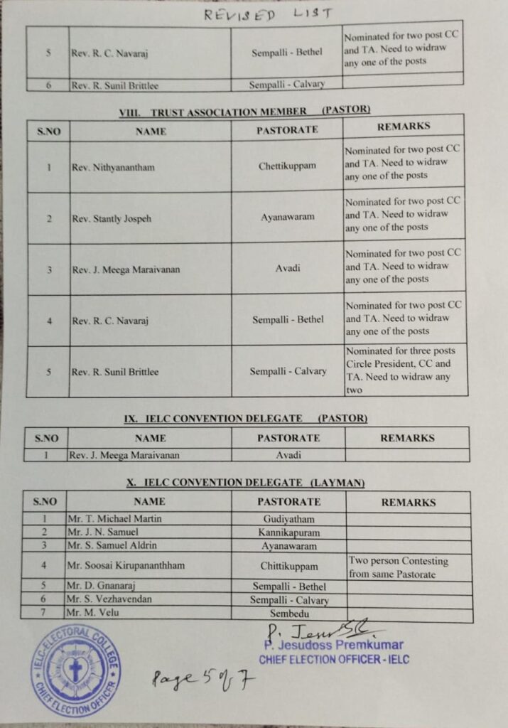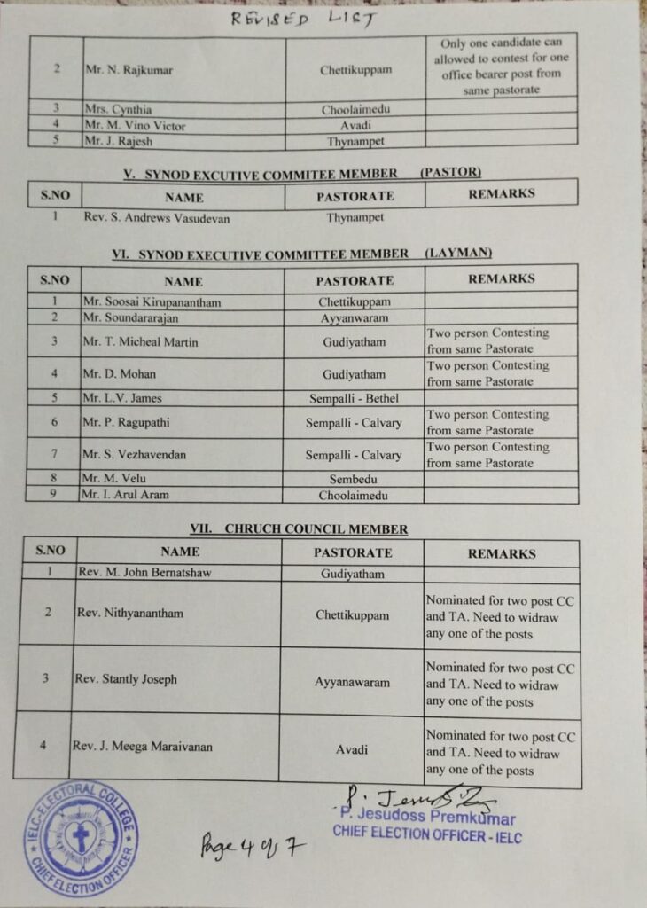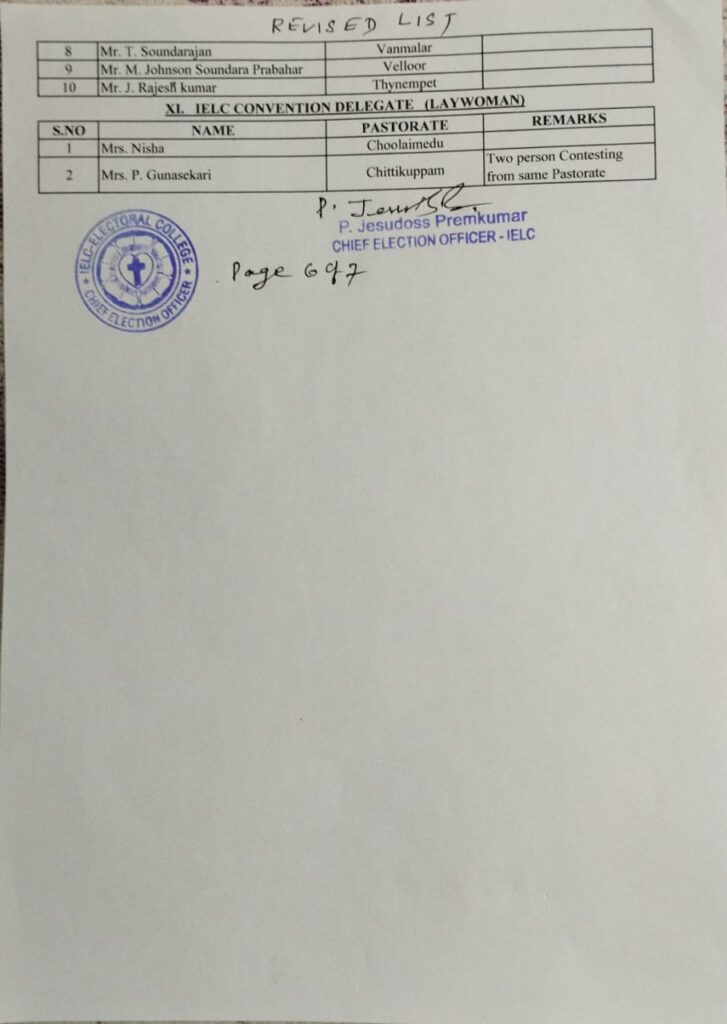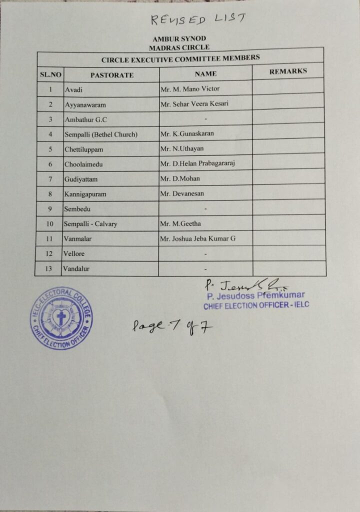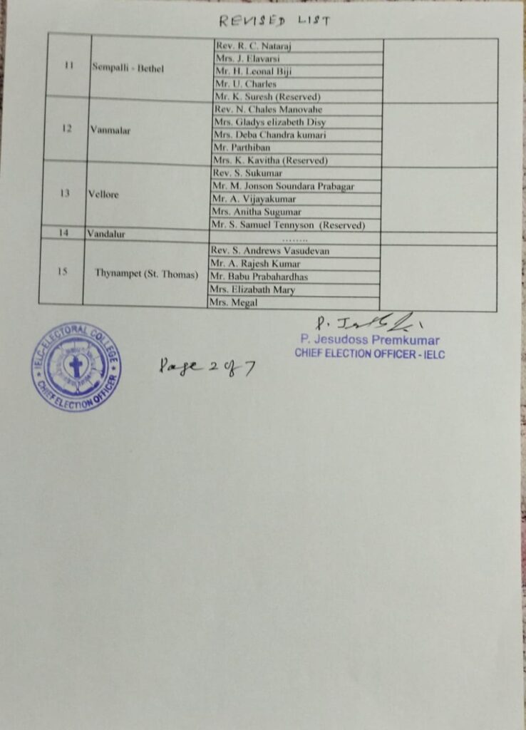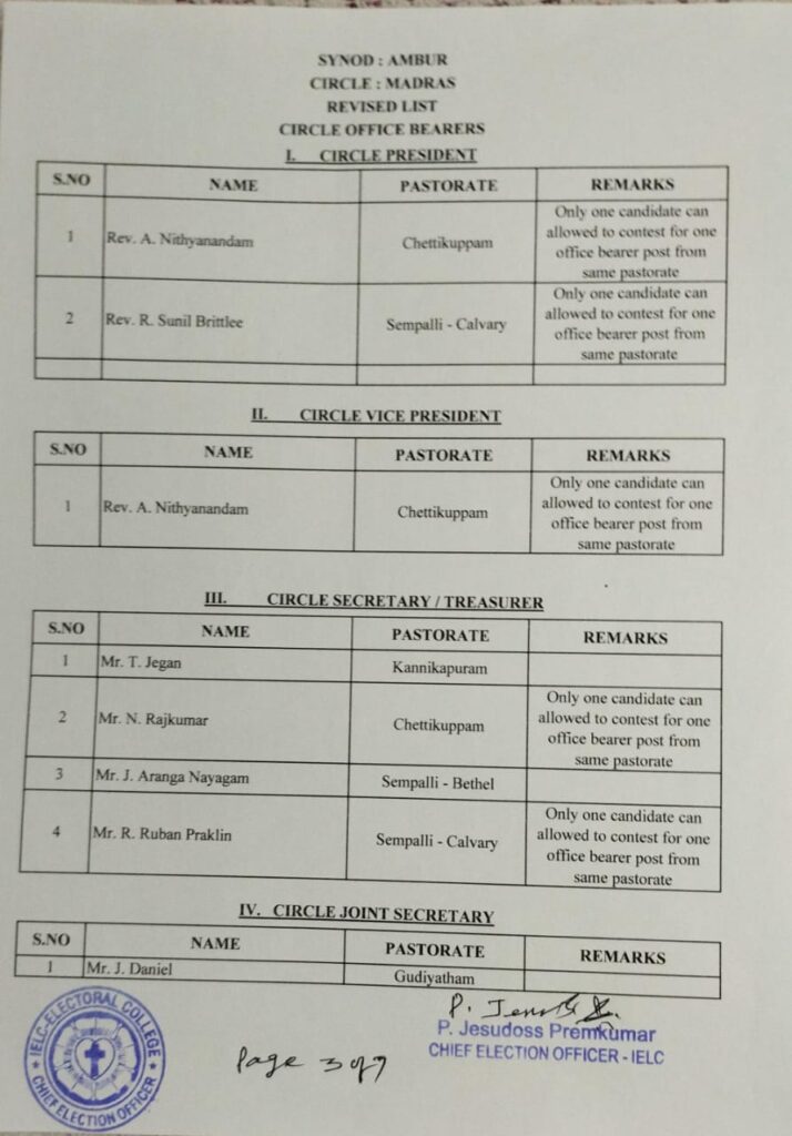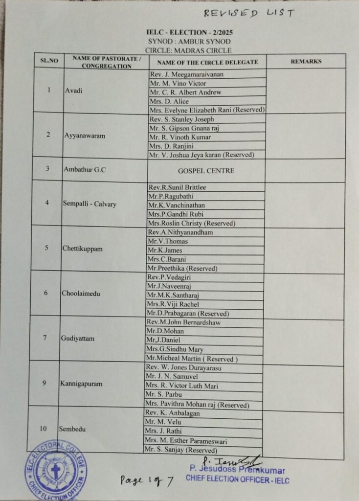 Revised List of candidates / delegates in Madras Circle – Ambur Synod
