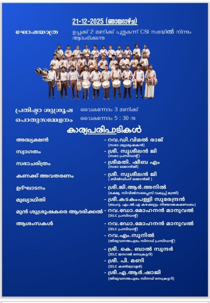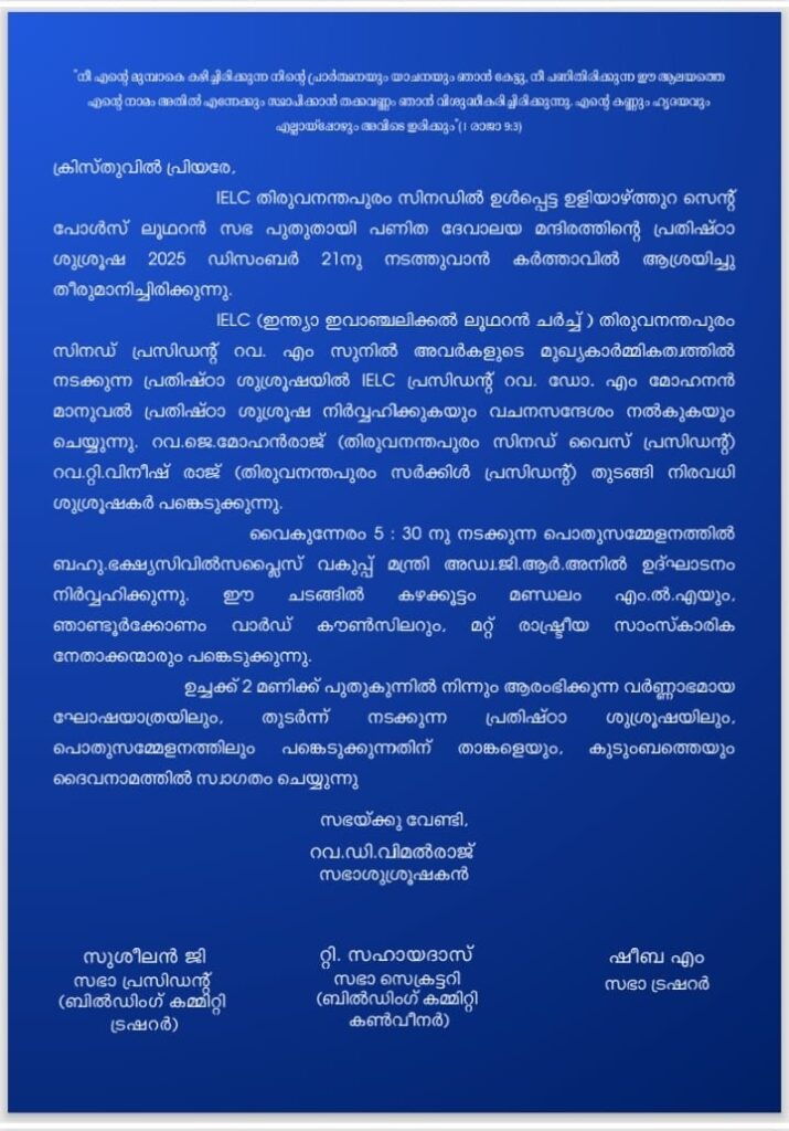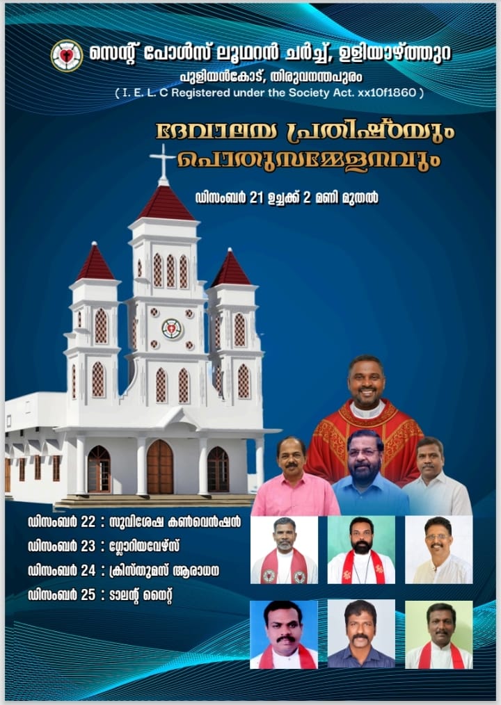 You are invited to the New Church Dedication Service of St. Paul’s Lutheran Church, Uliyazhathura, Trivandrum Circle, Trivandrum Synod, IELC, on 21st December 2025.