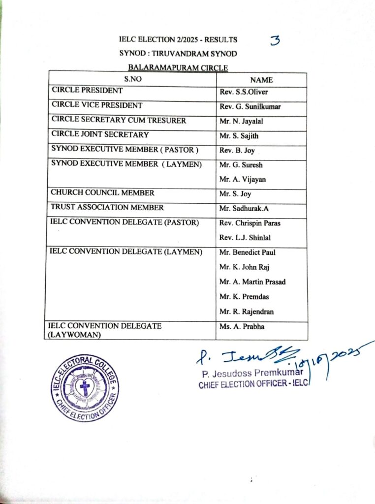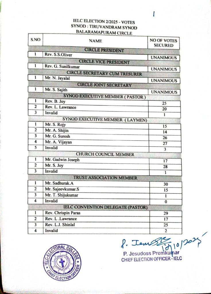 Trivandrum Synod Circle Election Results – Balaramapuram Circle.