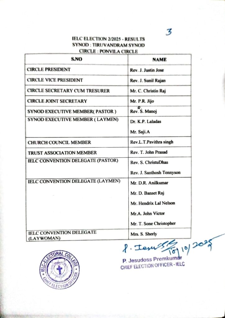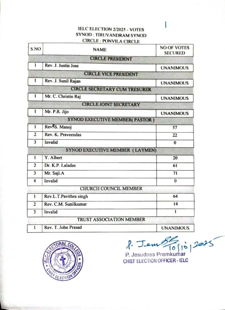 Trivandrum Synod Circle Election Results – Ponvila Circle.